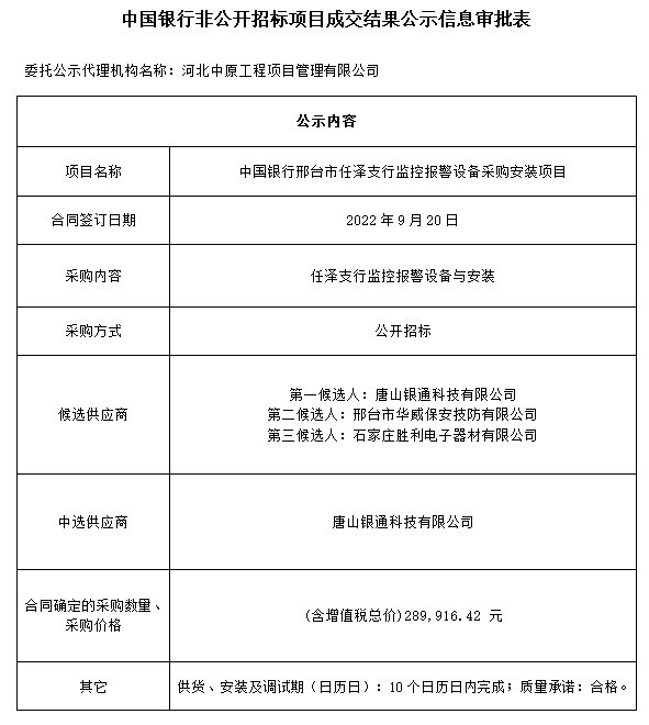 中国银行非公开招标项目成交结果公示信息审批表——中国银行邢台市任泽支行监控报警设备采购安装项目