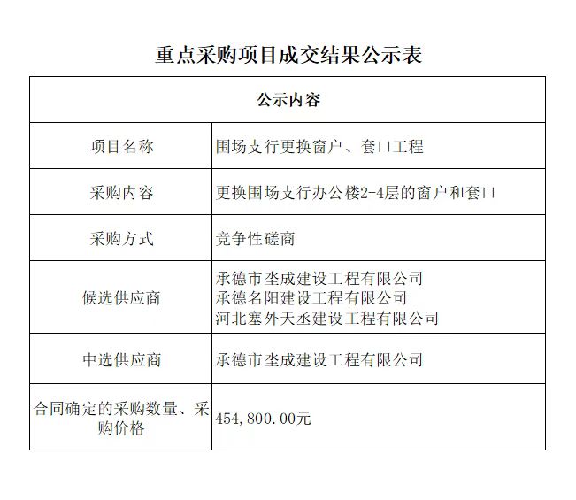 重点采购项目成交结果公示表——围场支行更换窗户、套口工程