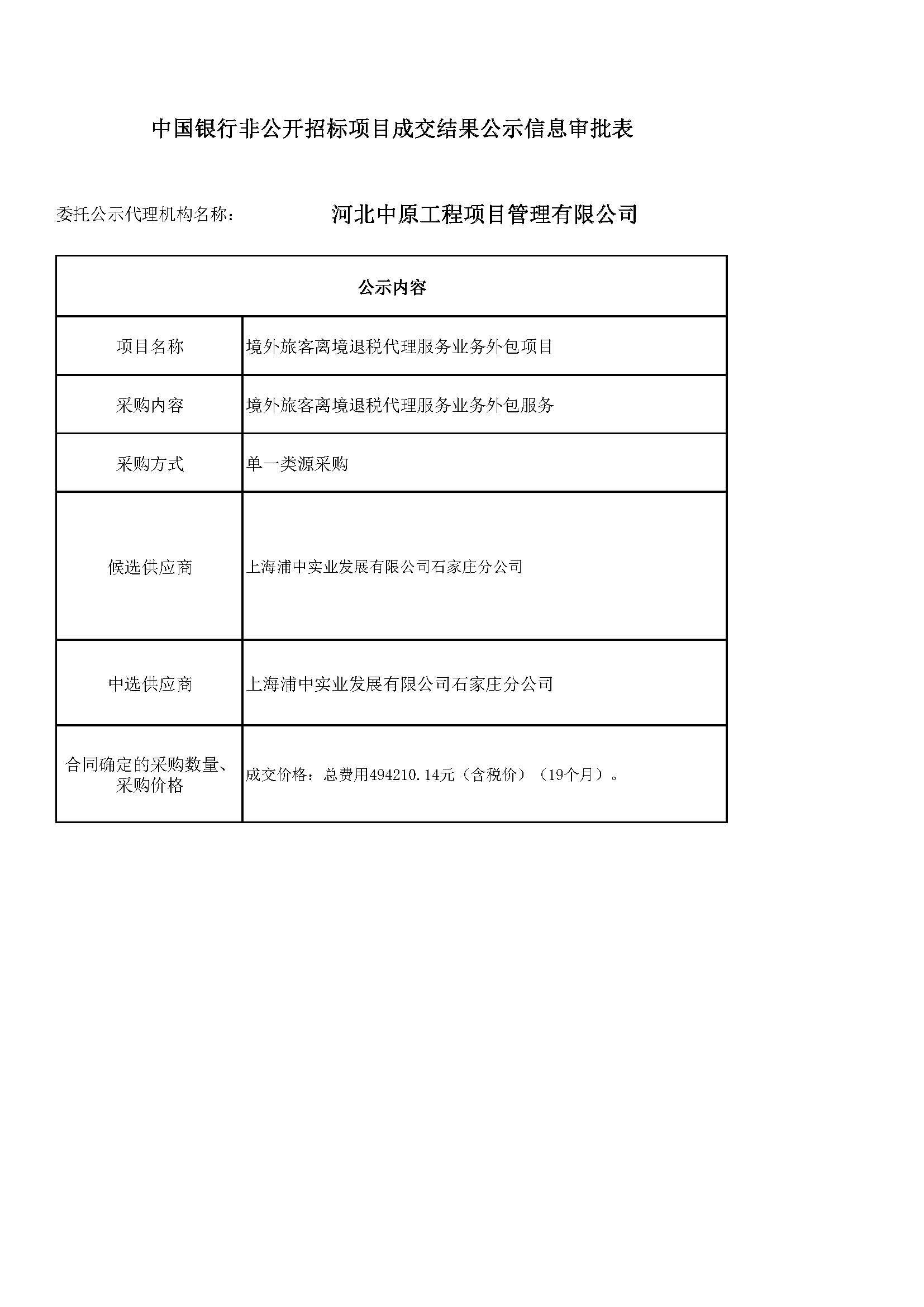 中国银行非公开招标项目成交结果公示信息审批表——石家庄分行住房公积金管理中心驻点服务外包项目