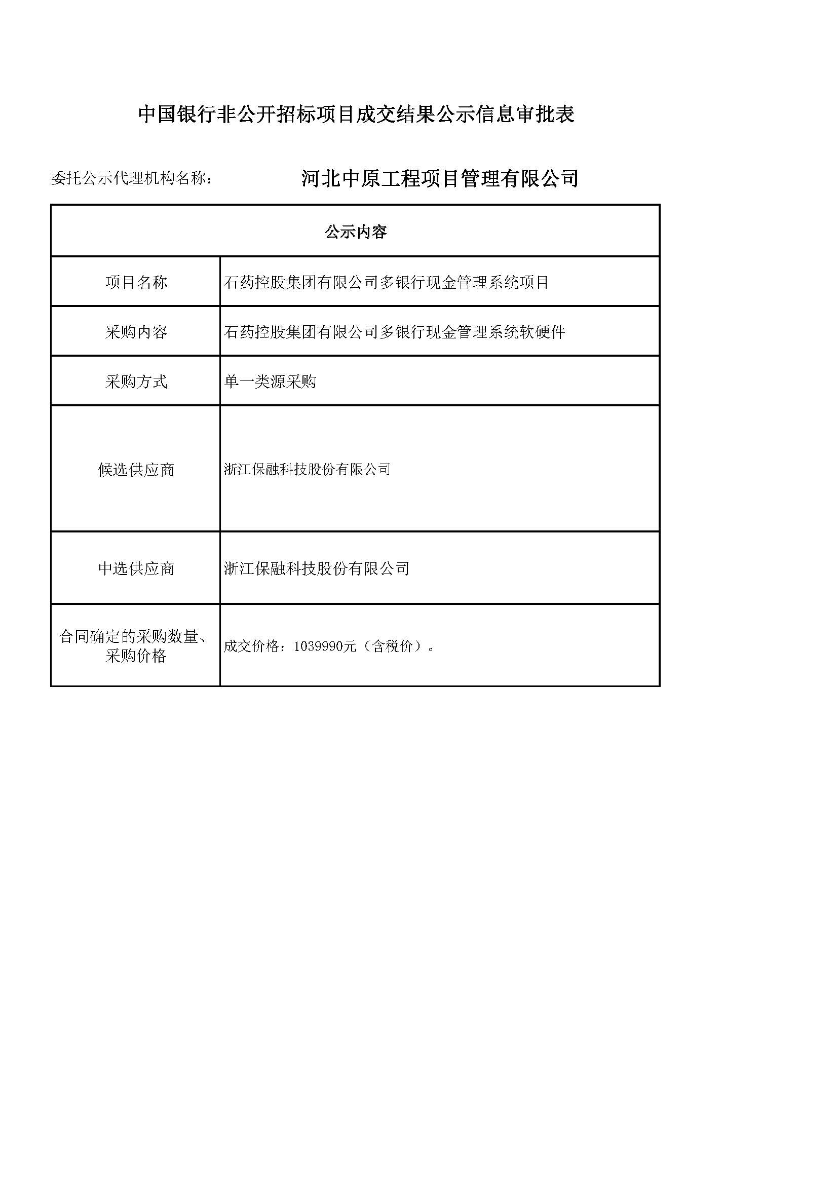 中国银行股份有限公司“石药控股集团有限公司多银行现金管理系统项目”集中采购信息公示