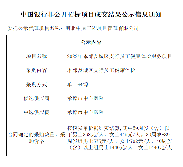 中国银行非公开招标项目成交结果公示信息通知——2022年本部及城区支行员工健康体检服务项目