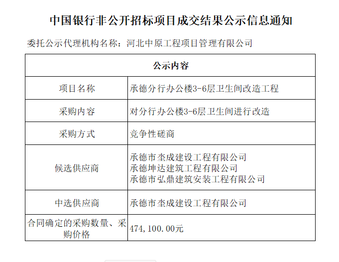 中国银行非公开招标项目成交结果公示信息通知——承德分行办公楼3-6层卫生间改造工程