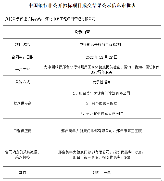 中国银行非公开招标项目成交结果公示信息审批表——中行邢台分行员工体检项目