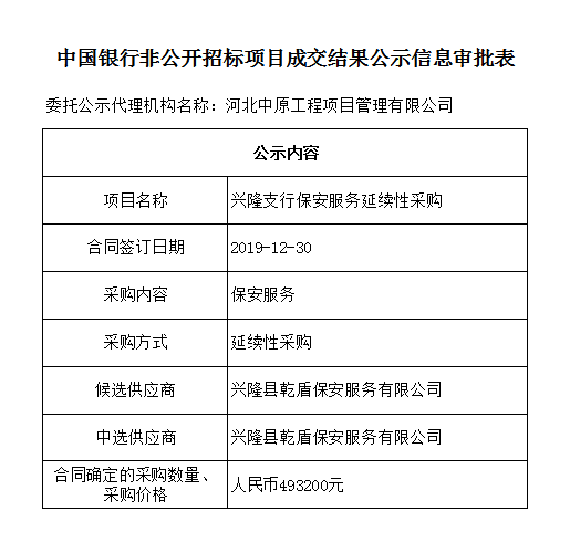 中国银行非公开招标项目成交结果公示信息审批表——兴隆支行保安服务延续性采购项目