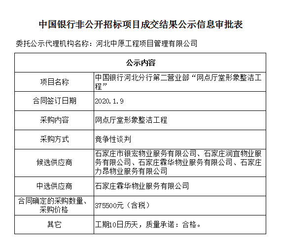 中国银行非公开招标项目成交结果公示信息审批表——河北分行第二营业部“网点厅堂形象整洁工程”