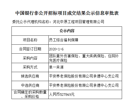 中国银行非公开招标项目成交结果公示信息审批表——员工综合福利保障