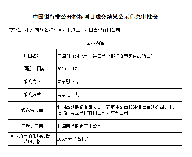 中国银行非公开招标项目成交结果公示信息审批表——河北分行第二营业部“春节慰问品项目”