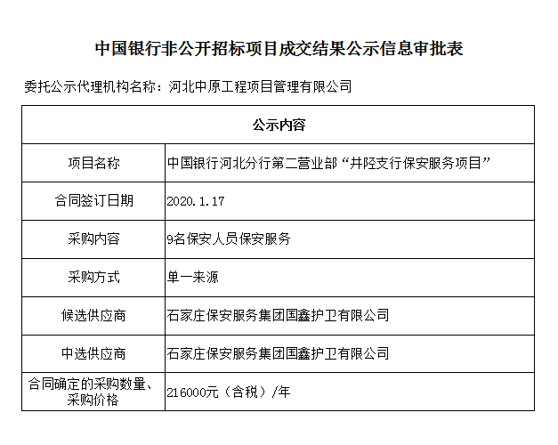 中国银行非公开招标项目成交结果公示信息审批表——河北分行第二营业部“井陉支行保安服务项目”