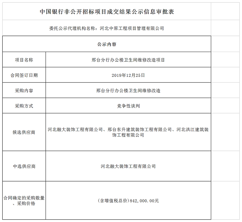 中国银行非公开招标项目成交结果公示信息审批表——邢台分行办公楼卫生间维修改造项目
