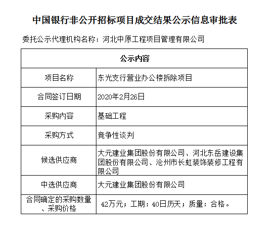 中国银行非公开招标项目成交结果公示信息审批表——东光支行营业办公楼拆除项目