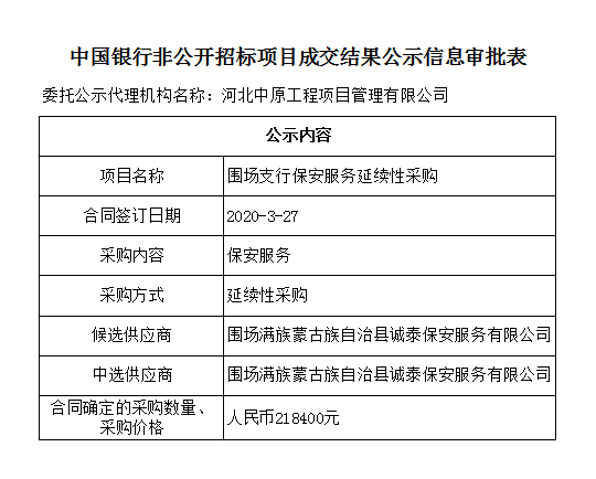 中国银行非公开招标项目成交结果公示信息审批表——围场支行保安服务延续性采购