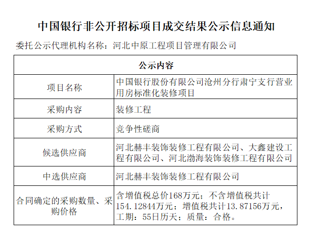 中国银行非公开招标项目成交结果公示信息通知——中国银行股份有限公司沧州分行肃宁支行营业用房标准化装修项目