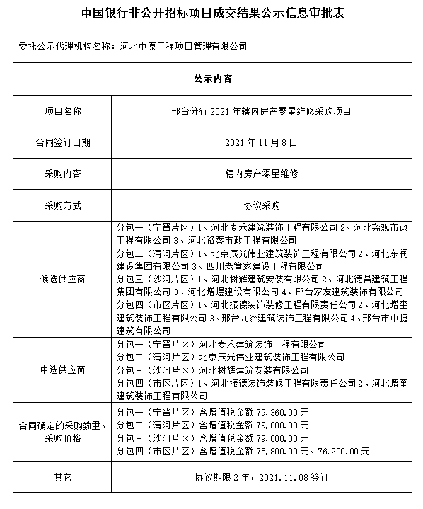 中国银行非公开招标项目成交结果公示信息审批表——邢台分行2021年辖内房产零星维修采购项目