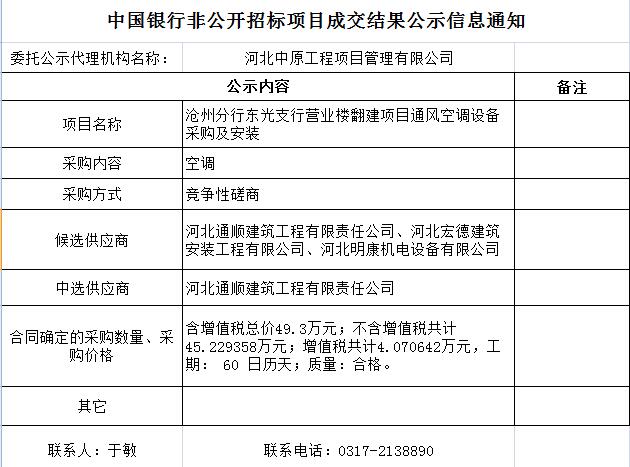 中国银行非公开招标项目成交结果公示信息通知——沧州分行东光支行营业楼翻建项目通风空调设备采购及安装