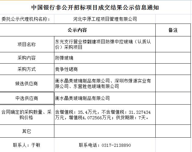 中国银行非公开招标项目成交结果公示信息通知——东光支行营业楼翻建项目防弹中控玻璃(认质认价)采购项目
