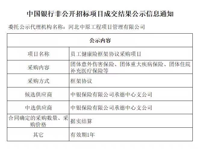 中国银行非公开招标项目成交结果公示信息通知——员工健康险框架协议采购项目