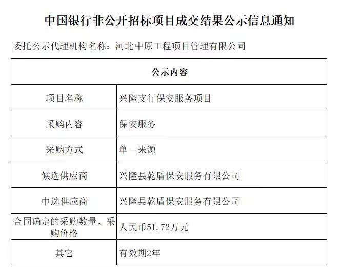 中国银行非公开招标项目成交结果公示信息通知——兴隆支行保安服务项目