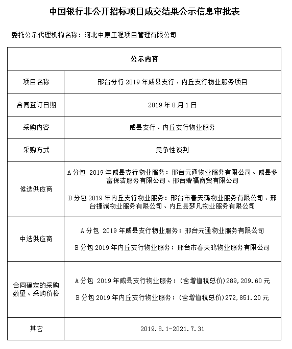 中国银行非公开招标项目成交结果公示信息审批表——邢台分行2019年威县支行、内丘支行物业服务项目