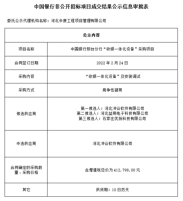 中国银行非公开招标项目成交结果公示信息审批表——中国银行邢台分行“收银一体化设备”采购项目
