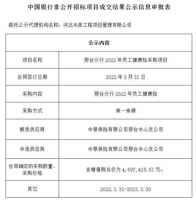 中国银行非公开招标项目成交结果公示信息审批表——邢台分行2022年员工健康险采购项目