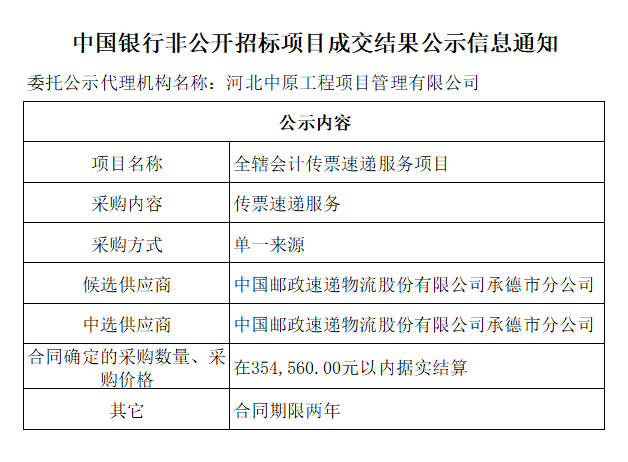 中国银行非公开招标项目成交结果公示信息通知——全辖会计传票速递服务项目