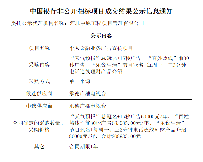 中国银行非公开招标项目成交结果公示信息通知——个人金融业务广告宣传项目
