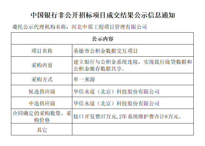 中国银行非公开招标项目成交结果公示信息通知——承德市公积金数据交互项目