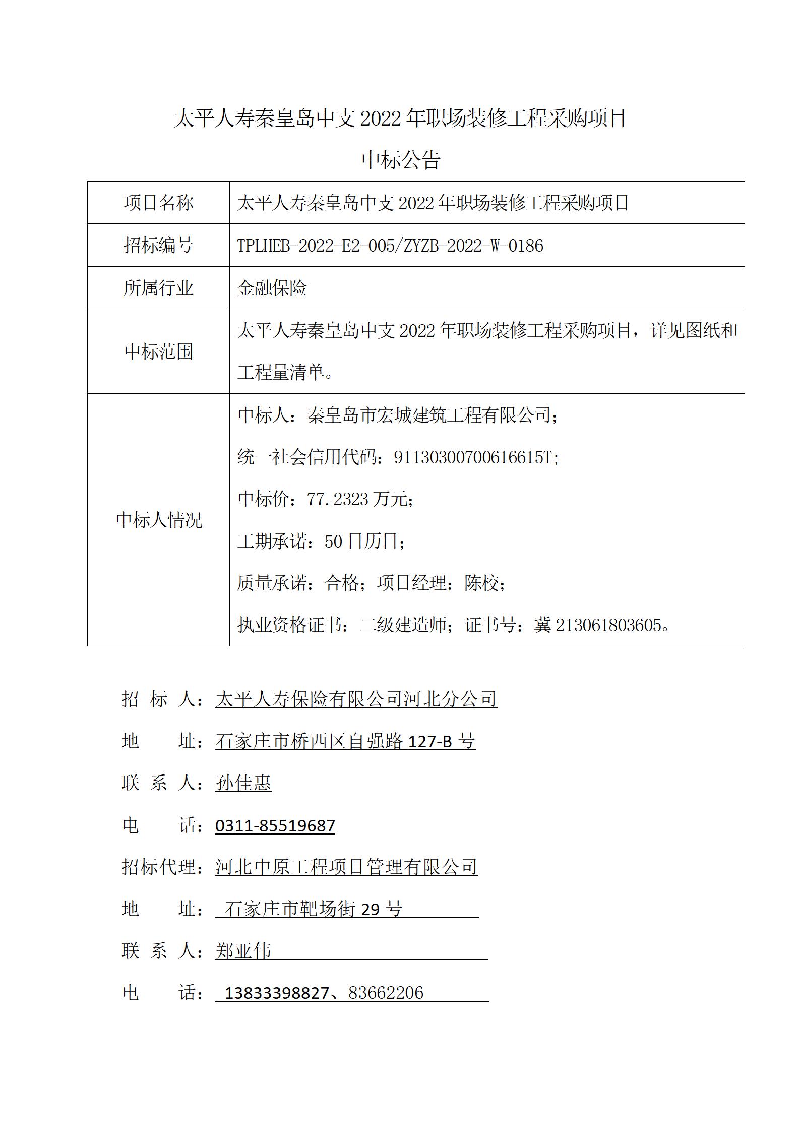 太平人寿秦皇岛中支2022年职场装修工程采购项目 中标公告