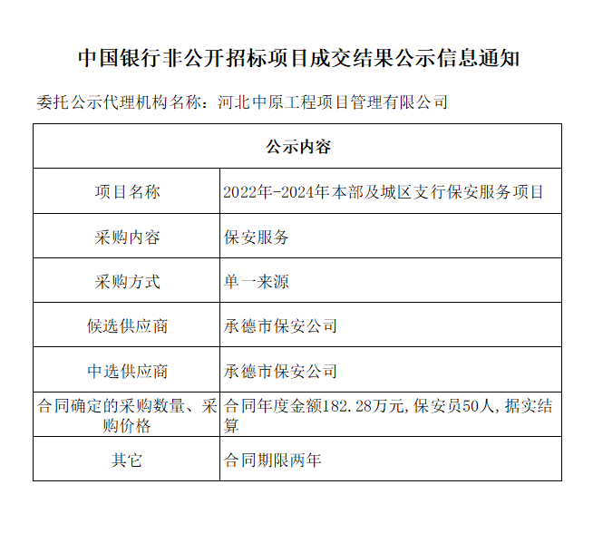 中国银行非公开招标项目成交结果公示信息通知——2022年-2024年本部及城区支行保安服务项目