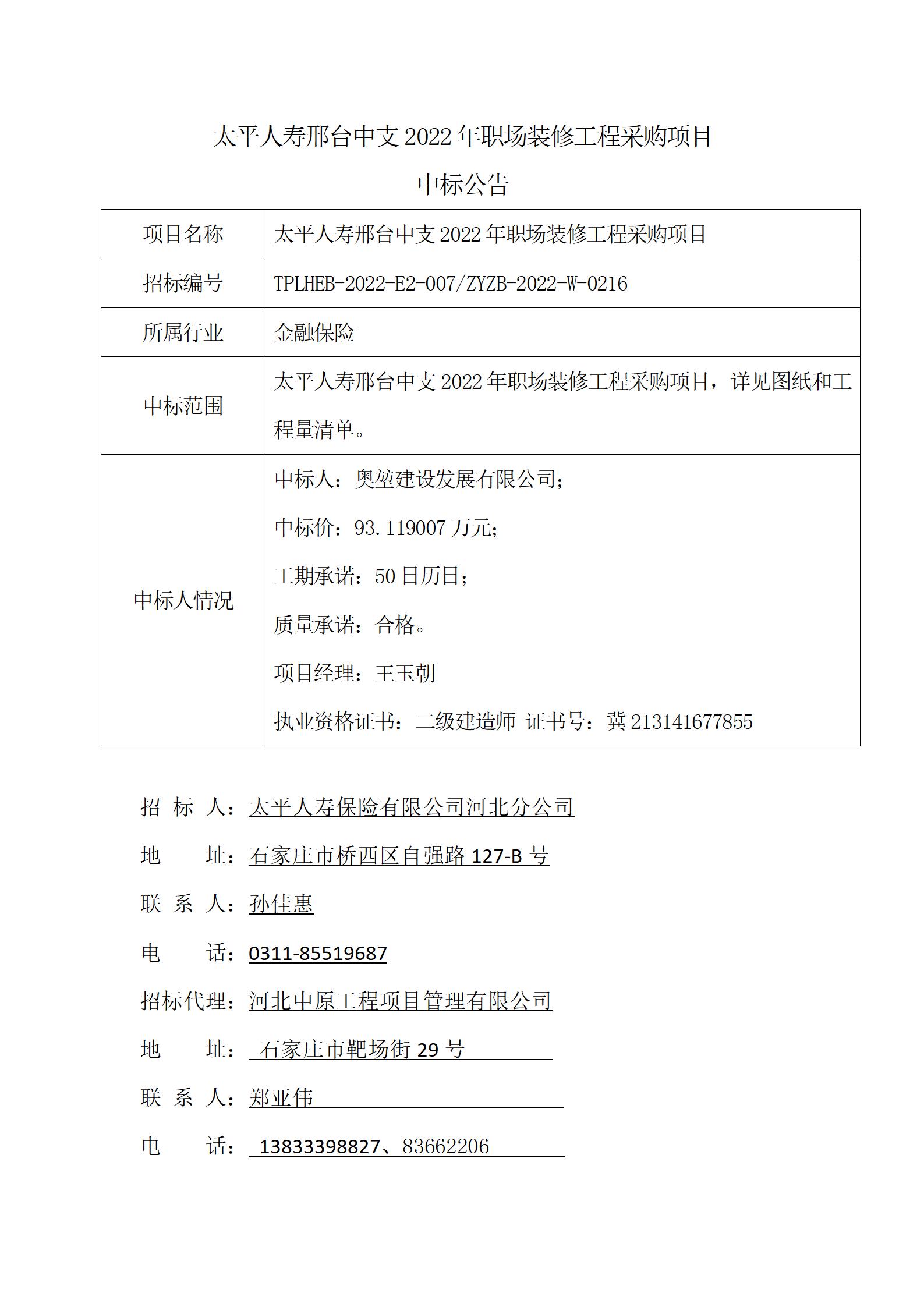 太平人寿邢台中支2022年职场装修工程采购项目 中标公告