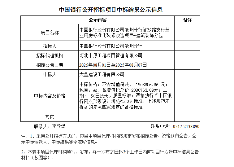 中国银行非公开招标项目成交结果公示中国银行股份有限公司沧州分行解放路支行营业用房标准化装修改造项目-建筑装饰分包