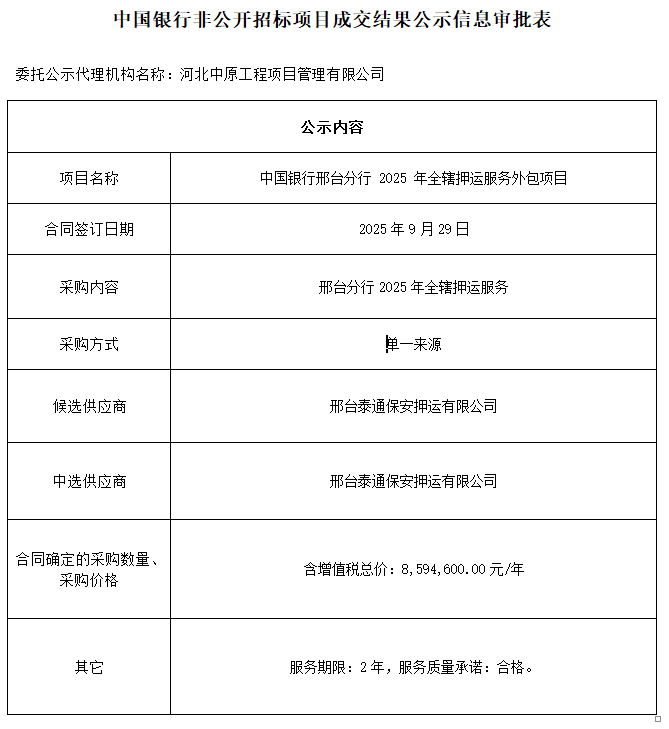 中国银行非公开招标项目成交结果公示信息审批表中国银行邢台分行2025年全辖押运服务外包项目