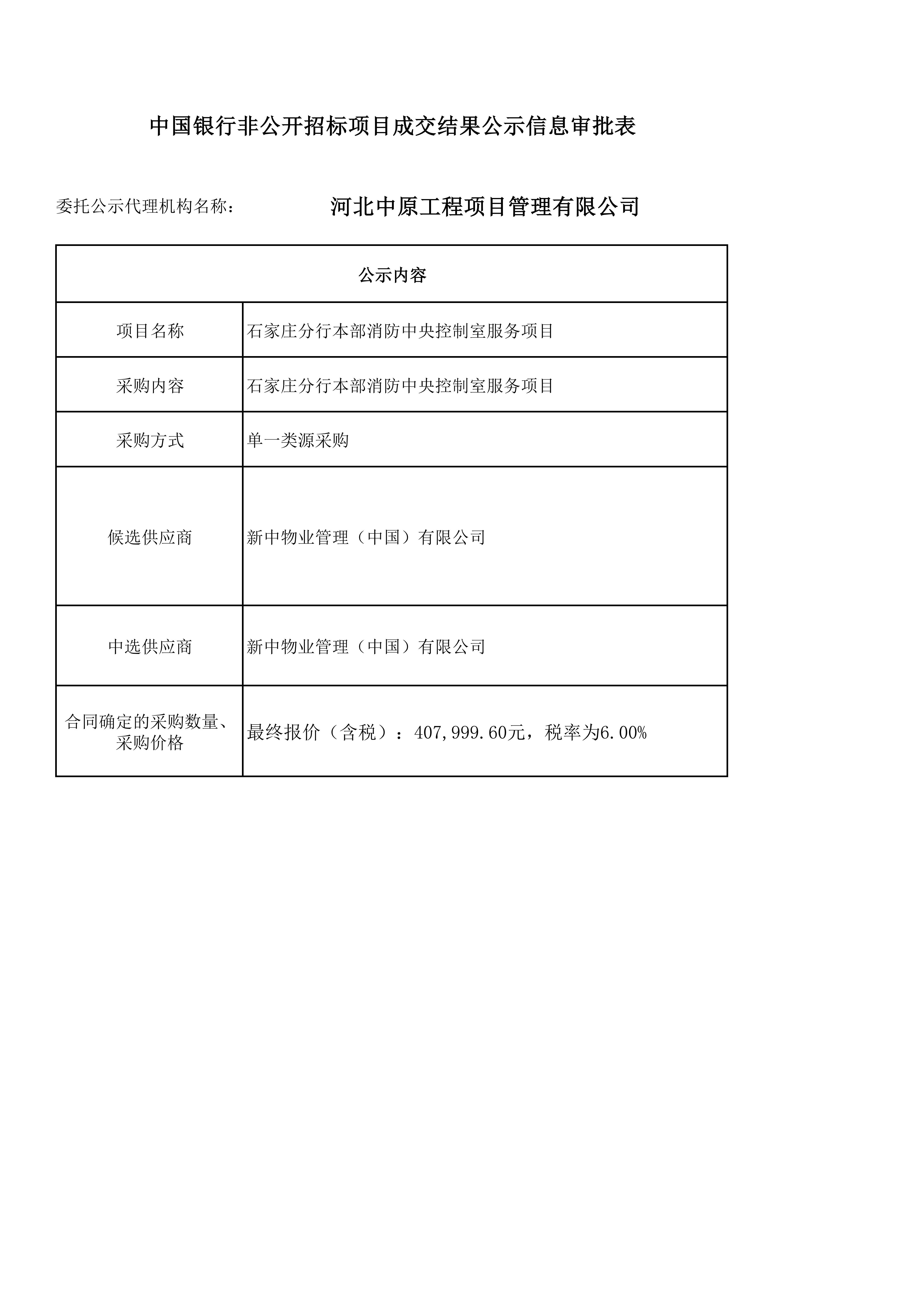 中国银行股份有限公司“石家庄分行本部消防中央控制室服务项目”集中采购信息公示