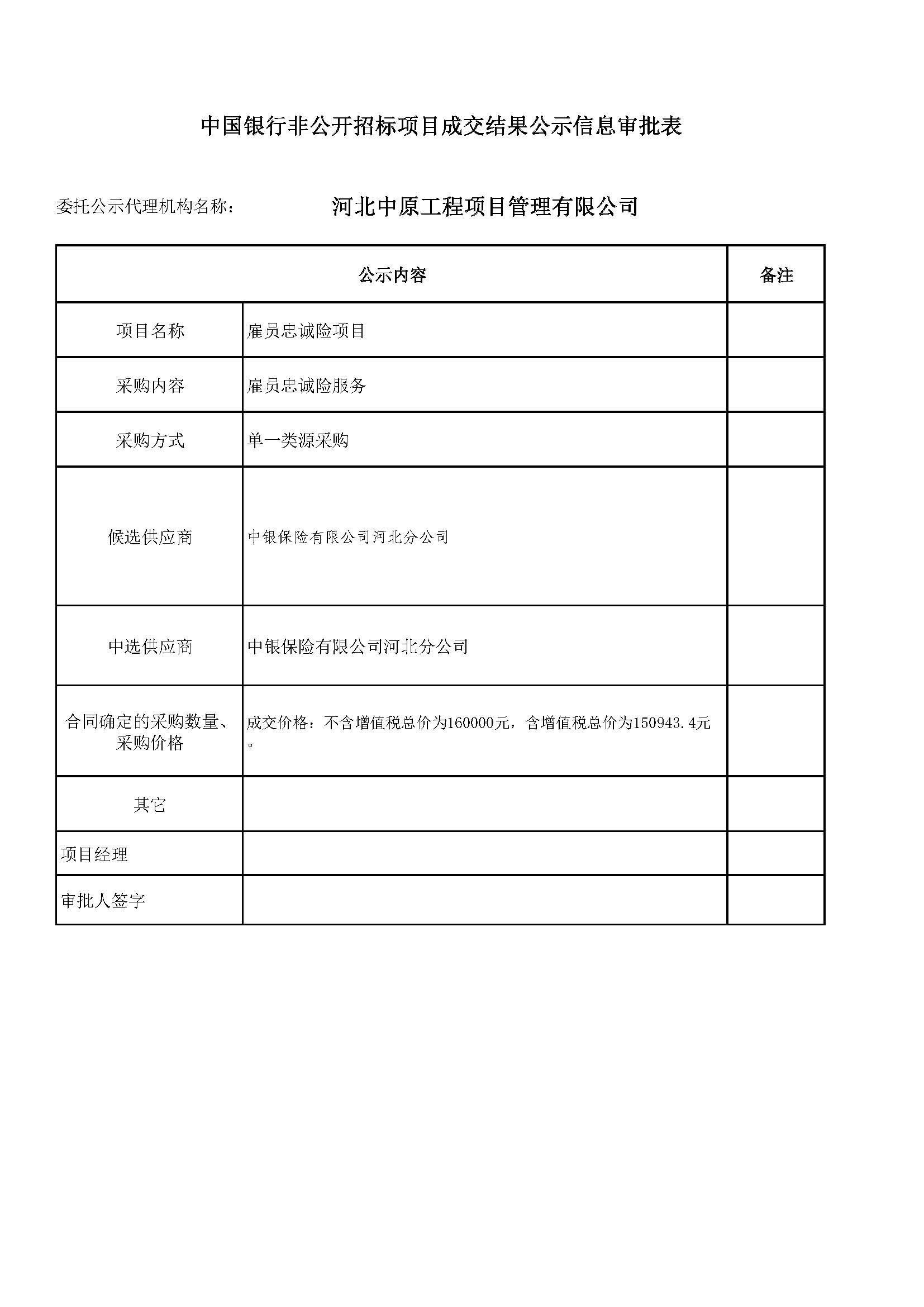 中国银行股份有限公司“雇员忠诚险项目”集中采购信息公示