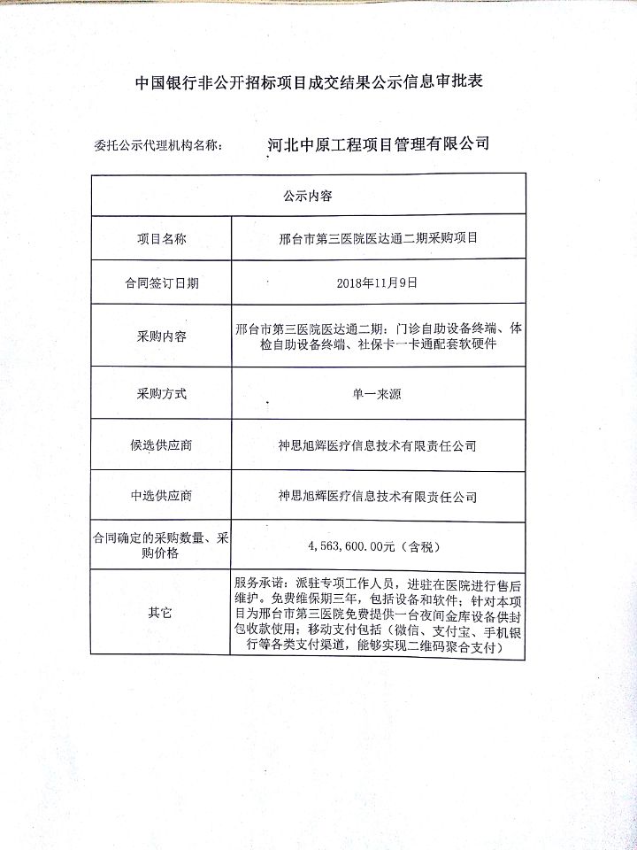 中国银行非公开招标项目成交结果公示信息审批表——邢台市第三医院医达通二期采购项目
