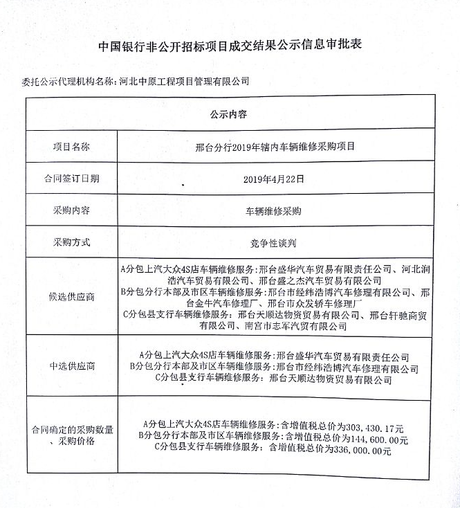 中国银行非公开招标项目成交结果公示信息审批表——邢台分行2019年辖内车辆维修采购项目