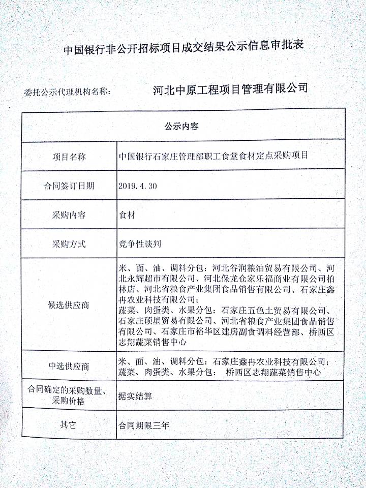 中国银行非公开招标项目成交结果公示信息审批表——中国银行石家庄管理部职工食堂石材定点采购项目
