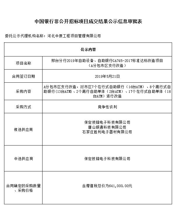 中国银行非公开招标项目成交结果公示信息审批表——邢台分行2019年自助设备、自助银行GA745-2017标准达标改造项目(B分包县域支行改造)