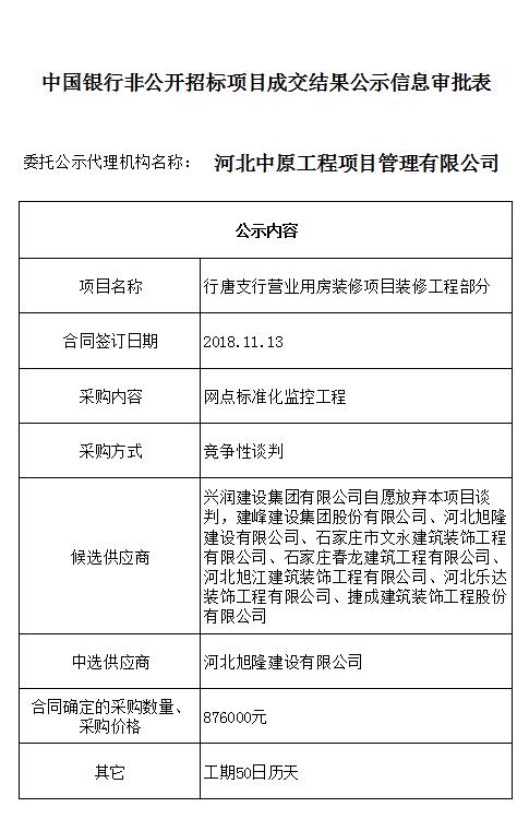 中国银行非公开招标项目成交结果公示信息审批表——行唐支行营业用房装修项目装修工程部分
