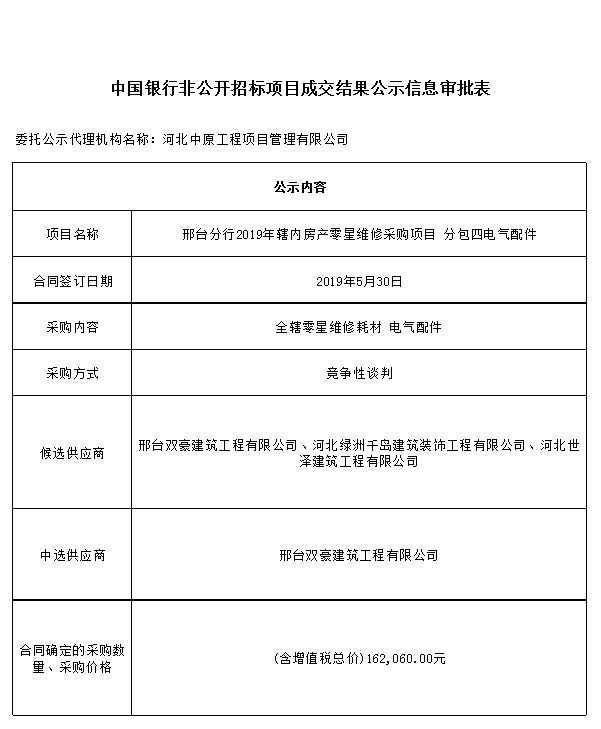 中国银行非公开招标项目成交结果公示信息审批表——邢台分行2019年辖内房产零星维修采购项目 分包四电气配件