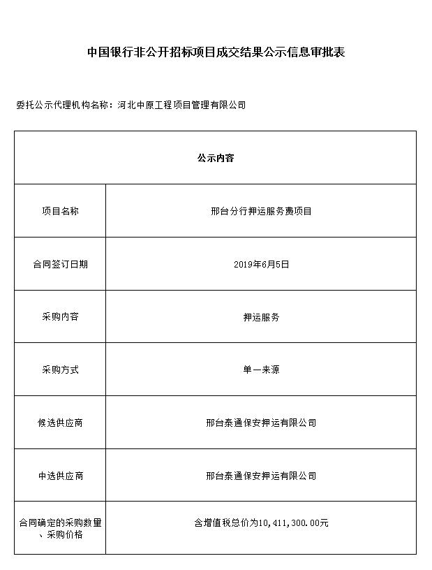 中国银行非公开招标项目成交结果公示信息审批表——邢台分行押运服务项目