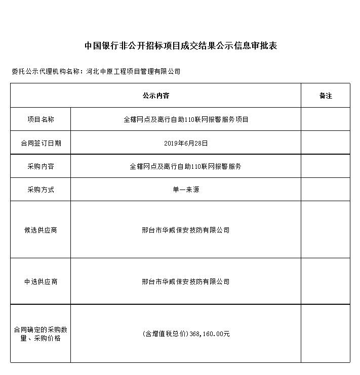 中国银行非公开招标项目成交结果公示信息审批表——全辖网点及离行自助110联网报警服务项目