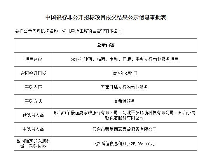 中国银行非公开招标项目成交结果公示信息审批表——2019年沙河、临西、南和、巨鹿、平乡支行物业服务项目
