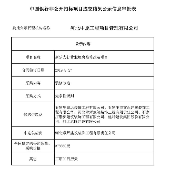 中国银行非公开招标项目成交结果公示信息审批表——新乐支行营业用房维修改造项目