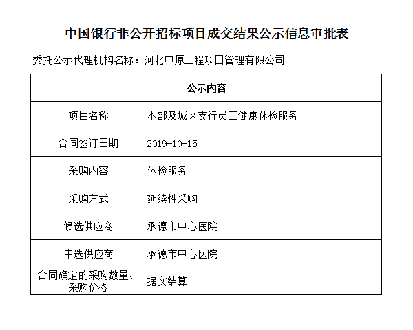 中国银行非公开招标项目成交结果公示信息审批表——本部及城区支行员工健康体检服务