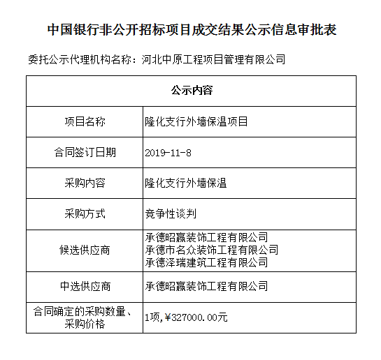 中国银行非公开招标项目成交结果公示信息审批表——隆化支行外墙保温项目