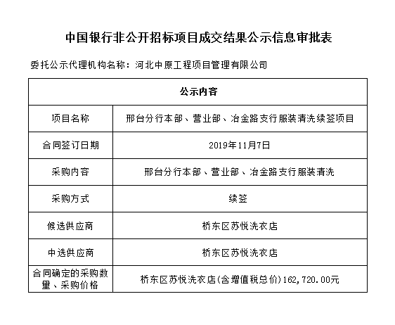 中国银行非公开招标项目成交结果公示信息审批表——邢台分行本部、营业部、冶金路支行服装清洗续签项目