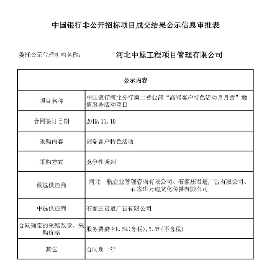 中国银行非公开招标项目成交结果公示信息审批表——河北分行第二营业部“高端客户特色活动月月营”增值服务活动项目
