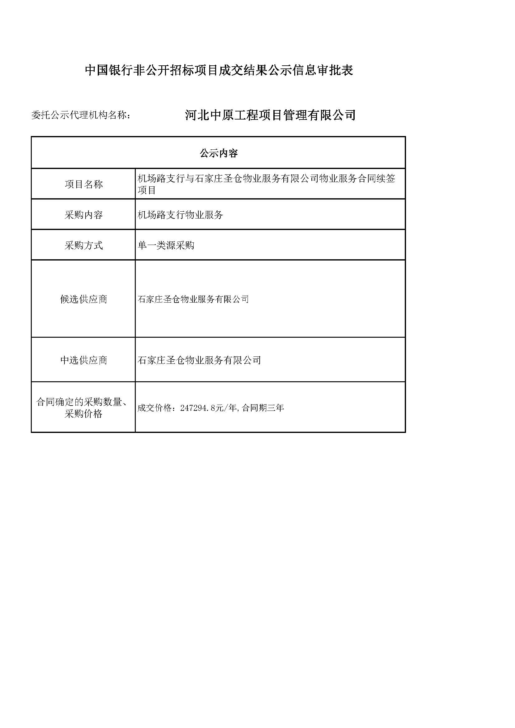 中国银行非公开招标项目成交结果公示信息审批表——机场路支行与石家庄圣仓物业服务有限公司物业服务合同续签项目
