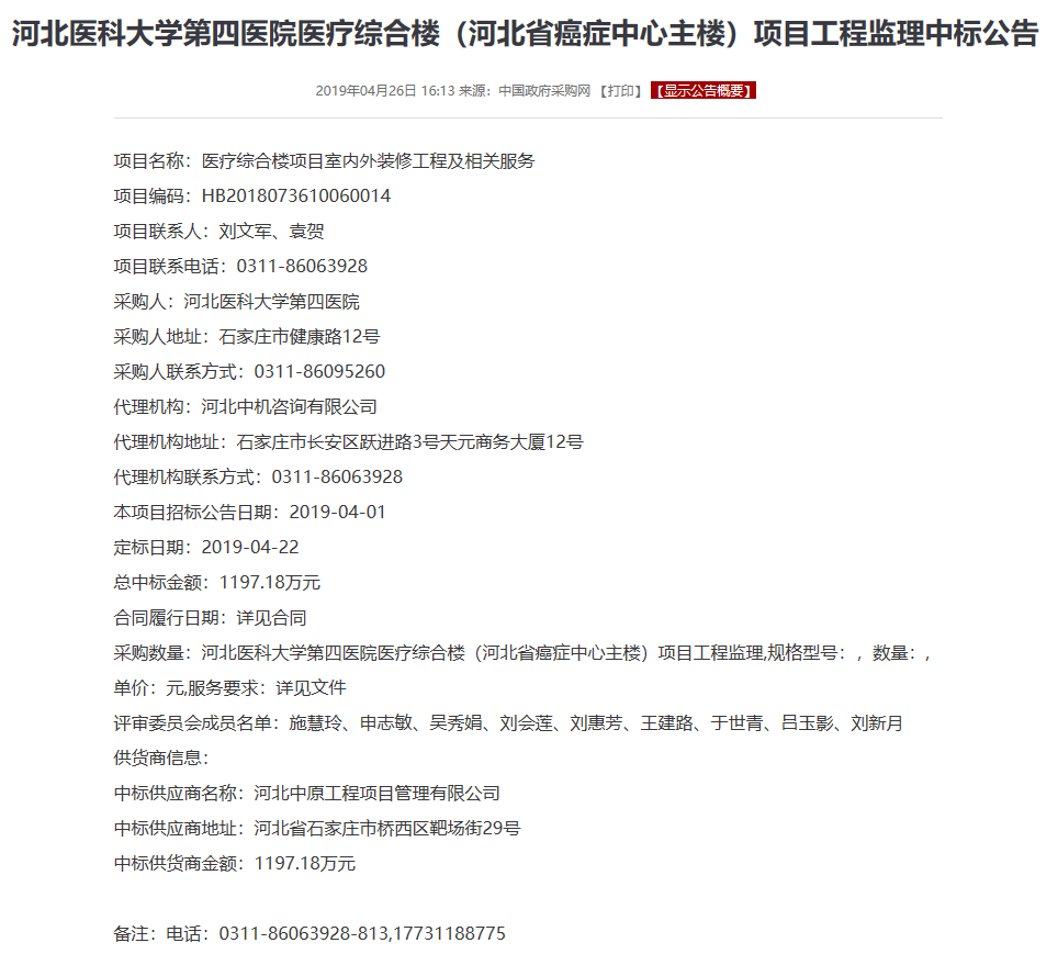 4月份,继阜东新区异地搬迁项目中标后,监理管理板块再传喜报,又一项千万级大标河北医科大学第四医院医疗综合楼(河北省癌症中心主楼)工程监理中标。